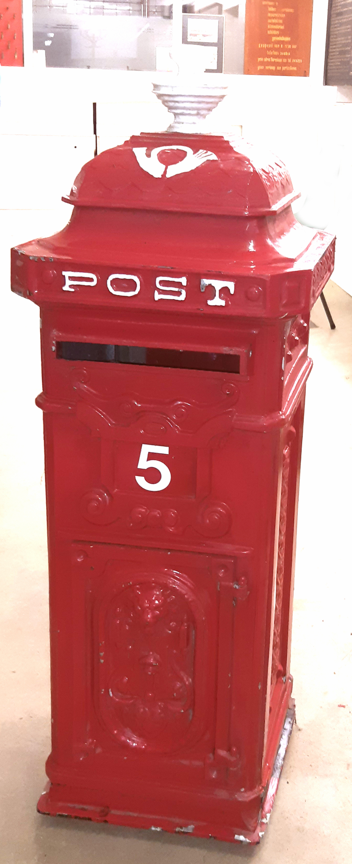 Vanaf 1850-52 komen er gietijzeren brievenbussen in de steden. Tegen 1860 hadden de postdienst er al meer dan 3000 in het hele land geplaatst, bij voorkeur bij openbare plaatsen als gemeentehuizen of kerken. En waren in die tijd voorzien van de Nederlandse leeuw. De bus heeft een afmeting van 38 x 38 x 105 cm.