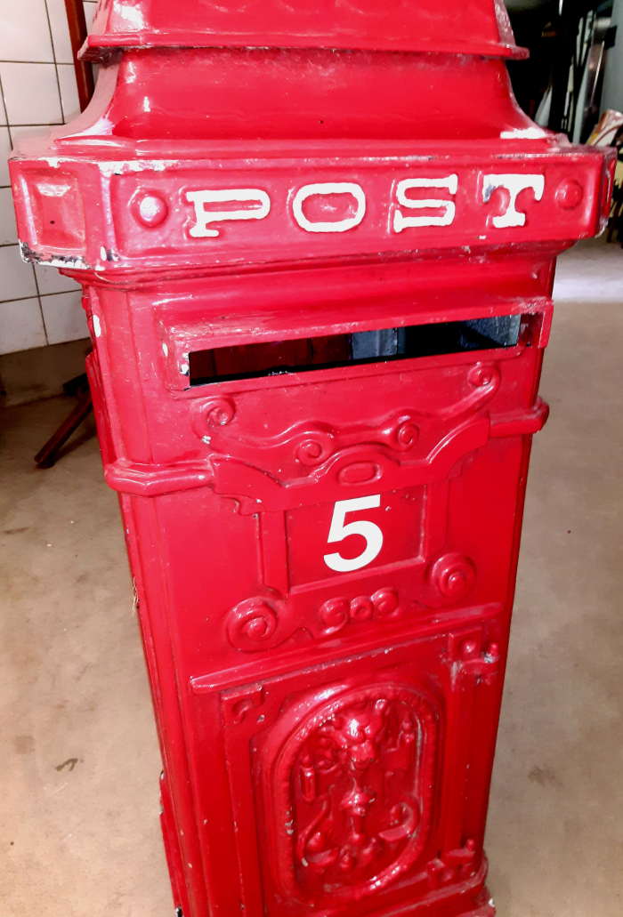 Betreft een antieke gietaluminium vrijstaande brievenbus.